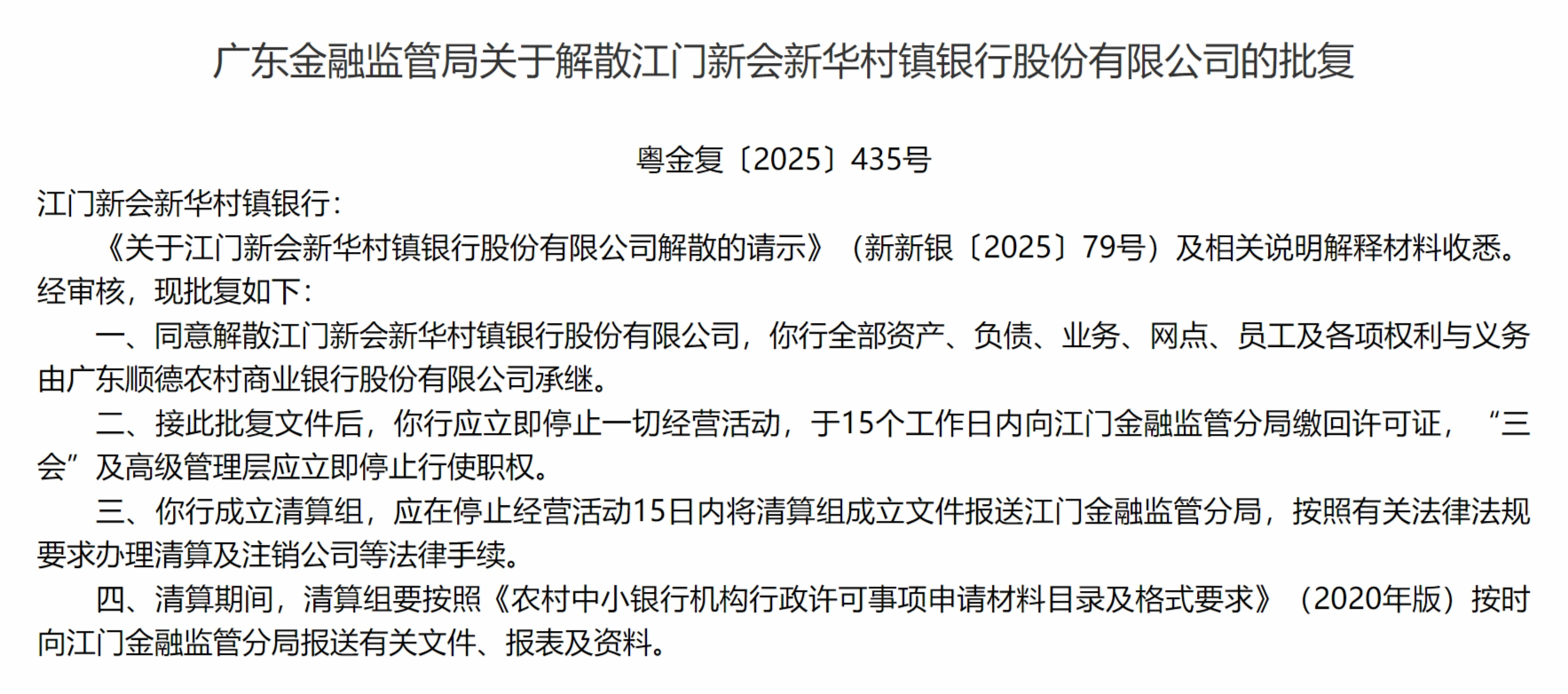 12月16日,广东金融监管局发布关于解散江门新会新华村镇银行股份有限公司的批复,同意解散江门新会新华村镇银行股份有限公司优配交易,该行全部资产、负债、业务、网点、员工及各项权利与义务由广东顺德农村商业银行股份有限公司承继。